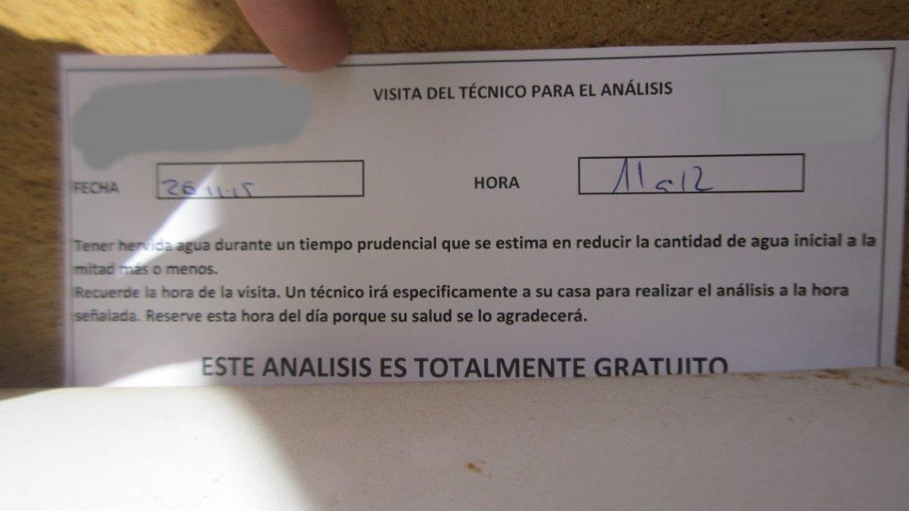 Están dejando notas en los domicilios concertando citas para realizar un supuesto análisis de agua.