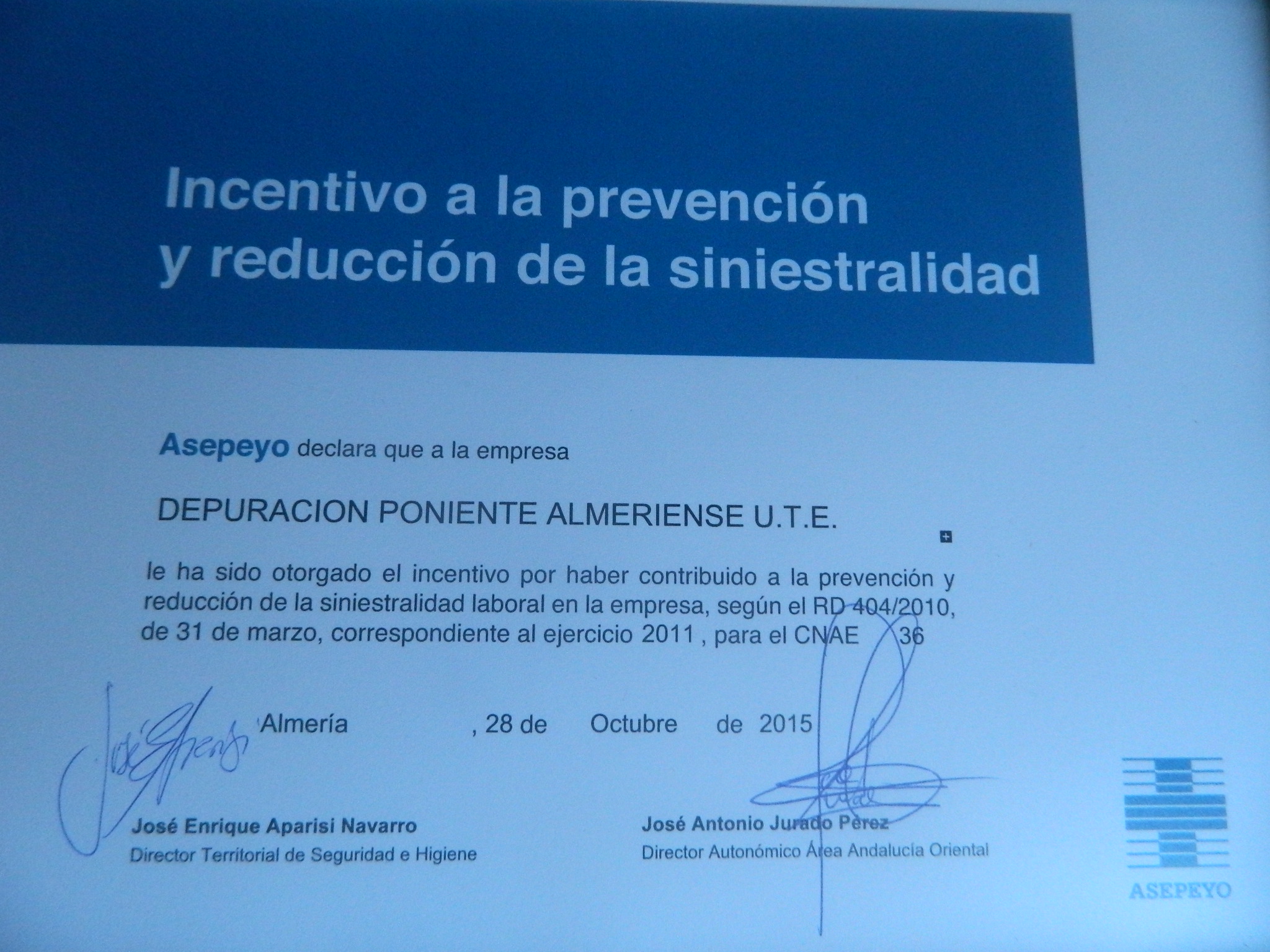 La UTE gestora de las depuradoras de Adra, Balerma, Dalías y El Ejido, participada en su mayoría por aqualia, ha sido reconocida por parte de la empresa mutualista Asepeyo por su baja siniestralidad, ya que no sufre ningún accidente desde el año 2010.