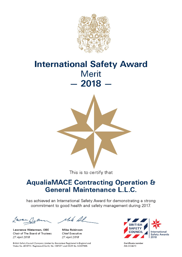 AqualiaMACE, sociedad formada por Aqualia y la compañía emiratí MACE, que actualmente realiza la gestión y operación de los servicios de saneamiento en Al Ain y su zona de influencia en el emirato de Abu Dhabi, ha sido distinguida recientemente con el Premio International Safety Awards en el nivel de mérito otorgado por la British Safety Council.