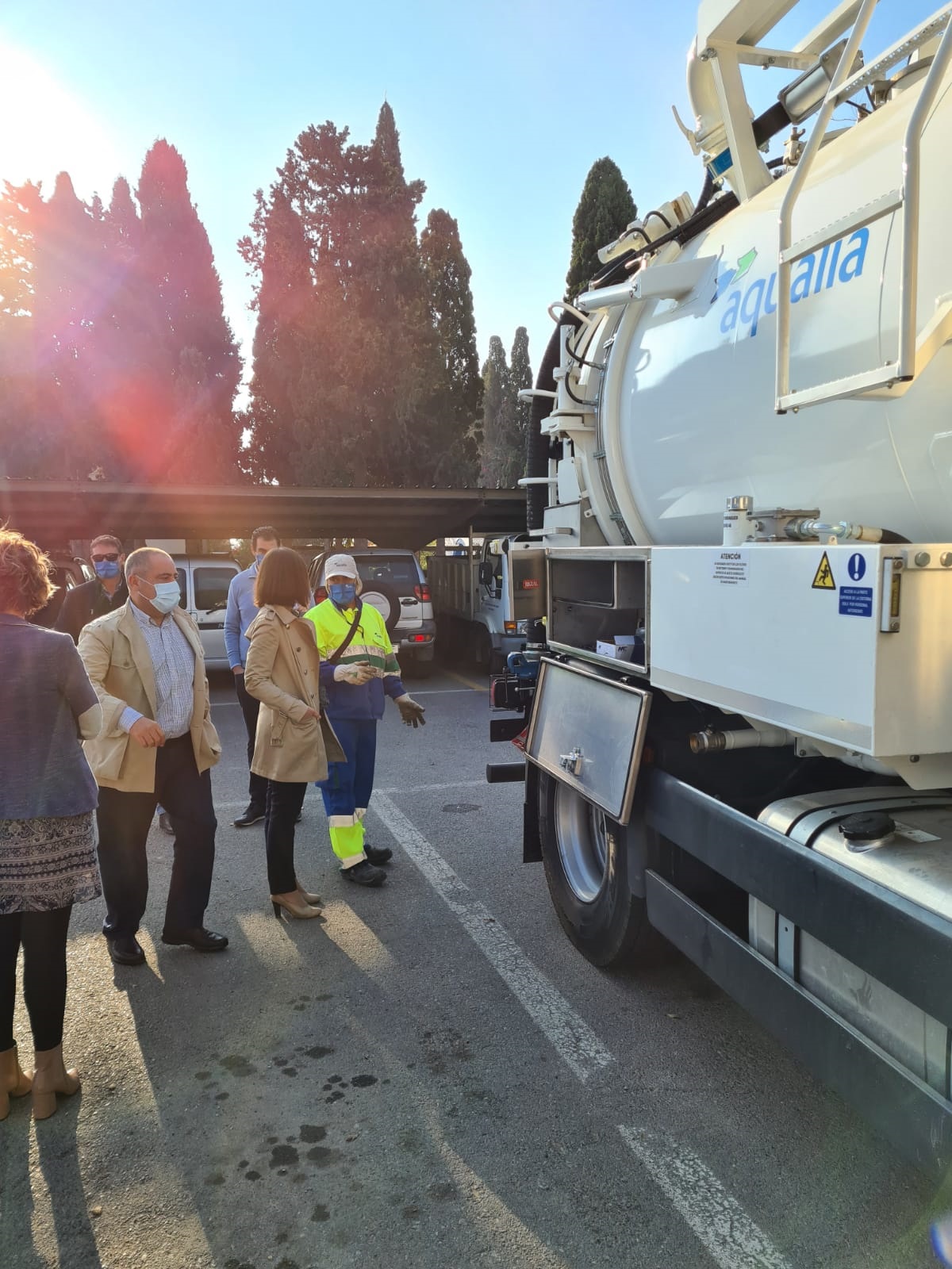 La Concejal de Servicios Municipales y Playas del Ayuntamiento de Almería, Margarita Cobos, ha acudido a las instalaciones de La Pipa para conocer este nuevo vehículo junto a José Antonio Otero, gerente de Aqualia en la ciudad.